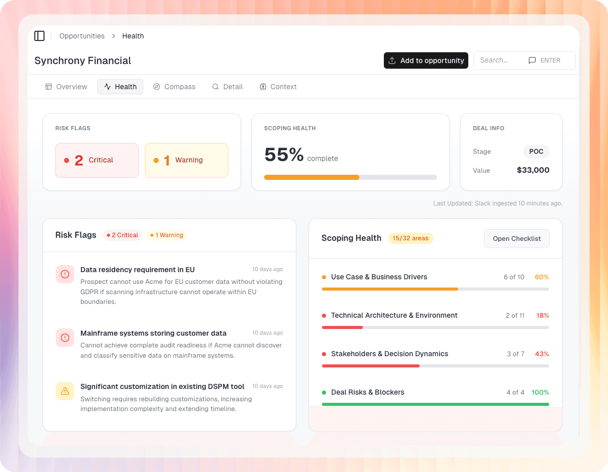 Tooling built for Solutions teams, by Coform. See what's at risk, what to do about it and the impact you have.